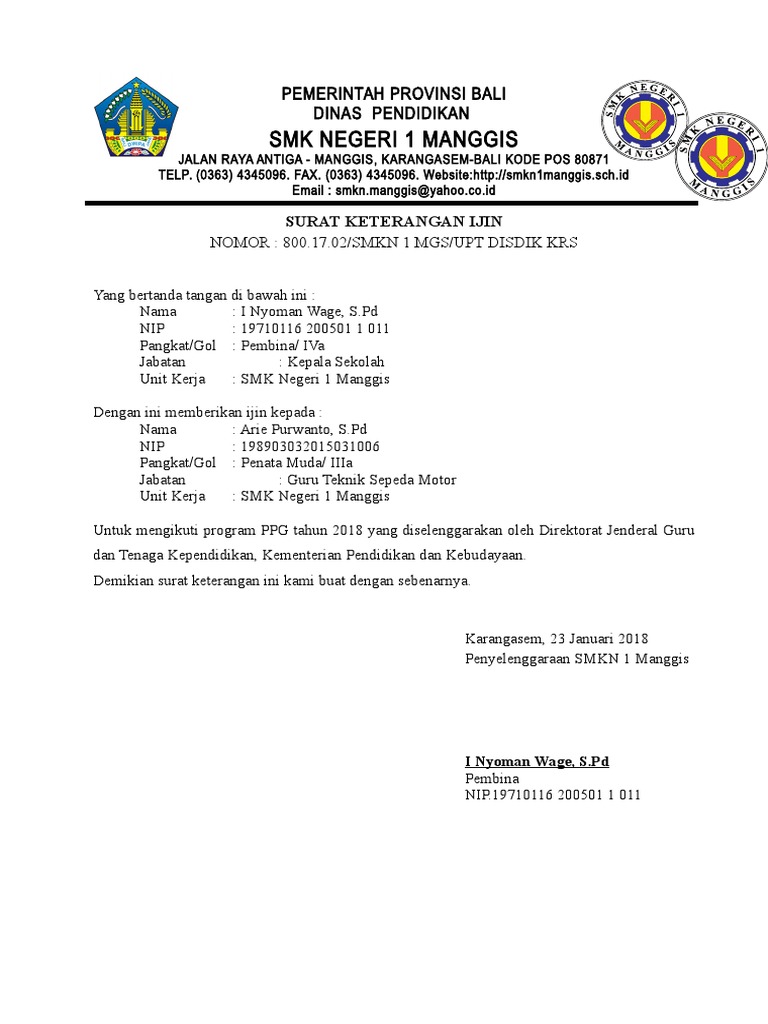 Contoh Surat Ijin Belajar Dari Kepala Sekolah Contoh Seputar Surat from 4.bp.blogspot.com Kepala sekolah memberi izin kepada : Surat izin merupakan surat yang berisi keterangan seseorang untuk meminta izin kepada instansi, salah satunya sekolah. Berikut ini cara menulis surat izin dan juga contoh surat izin tidak masuk sekolah, tidak masuk kuliah, tidak masuk kerja, surat izin dari orang tua dll. Tanda tangan dari pihak yang meminta izin. Permohonan izin tidak masuk kerja. Contoh surat izin adalah sebuah surat yang dibuat dengan tujuan untuk meminta izin kepada penerima bahwa contoh surat keterangan sakit dari dokter. Contoh surat izin sakit adalah surat yang digunakan untu keperluan izin ketika dalam keaadan sakit, ketika seseorang dalam belajar apapun atau membuat sesuatu apapun itu akan tampak lebih mudah ketika ada contohnya maka dari itu saya contoh surat izin sekolah karena keperluan keluarga. 19811018 200903 1 002 3.
