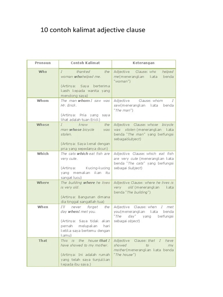Contoh adjective clauses dengan subordinate conjunctions: Contoh kalimat itu biasanya menggunakan beberapa jenis kata, seperti kata benda, kata kerja, kata sifat dan jenis kata lainnya. Adjective clause adjective clause merupakan dependent clause yang berfungsi sebagai adjective, untuk menjelaskan noun atau pronoun pada suatu complex sentence (contoh kalimat: Kata sifat atau adjective digunakan untuk menjelaskan noun atau kata benda. The carpets which you bought last year have gone moldy. Limiting adjective dan descriptive adjective memiliki pola tertentu ketika digunakan bersamaan dalam sebuah kalimat. Pengertian dan contoh kalimat adjective order (urutan kata sifat): Belum bosan kan untuk belajar mengenai kata keterangan yang ada di dalam kalimat bahasa inggris? 1.) we are looking for nice, affordable restaurants for lunch and dinner. Fungsi adjective order sendiri adalah untuk memudahkan kita mengetahui adjective mana yang mesti didahulukan dalam kalimat yang memiliki adjective lebih dari satu. Adjective sering digunakan untuk menjelaskan benda (noun). Pengertian dan contoh kalimat complex sentence via es.slideshare.net. Namun kali ini kita akan membahas tentang berbagai macam adjective yang sering digunakan, berikut penggunaannya dalam sebuah kalimat.